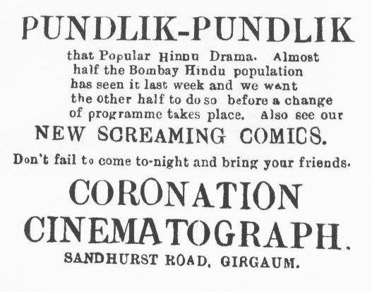 Often presented as the first Indian film. Usually credited to R.G. Torney, but recent research suggests he was only marginally involved. Made jointly by N.G. Chitre, the manager of the Coronation Cinematograph in Bombay, and P.R. Tipnis, later a major Delhi-based distributor. The film about the Hindu saint is based, according to Harish Booch (1964), on Ramrao Kirtikar’s Marathi play as staged by the Shripad Sangeet Mandali of Nasik. Shot on location in Bombay’s Mangalwadi compound near Grant Road by a Bourne & Shepherd crew and released at the Coronation on 18th May, 1912. For the record, it must be pointed out that film-makers such as Hiralal Sen had made similar films of stage plays before Pundalik.